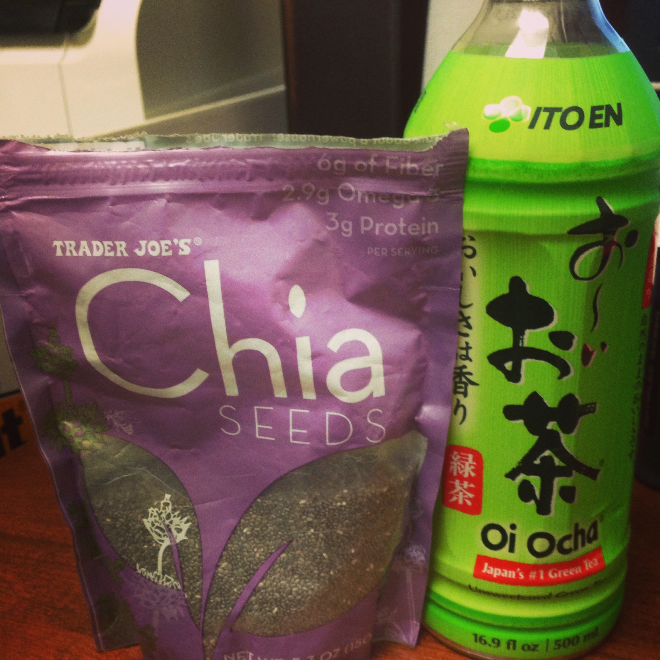 1 Tbsp. of Chia has 70 calories (40 from fat), very little sodium, 6 grams of fiber (makes you feel full longer so you don’t get hungry and eat more than you need to), 2.9 grams of Omega-3s (this is the ‘good & healthy’ fat that our body NEEDS, as opposed to the bad fat found at fastfood restaurants), 1 gram of carbs, and 3 grams of protein. I get my Chia from Trader Joe’s and my Green Tea from Target. I also put chia in my yogurt (the few times I eat yogurt), in my protein shakes, and other shtuff.